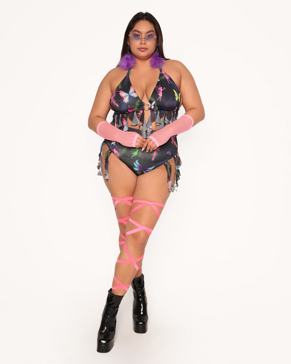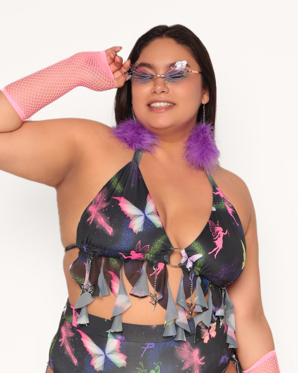 The dance floor awaits your arrival in the Butterfly Soirée O-Ring Top! With its dazzling butterfly print. ethereal glow. and flirty o-ring detail. this top is made for raving under the stars.