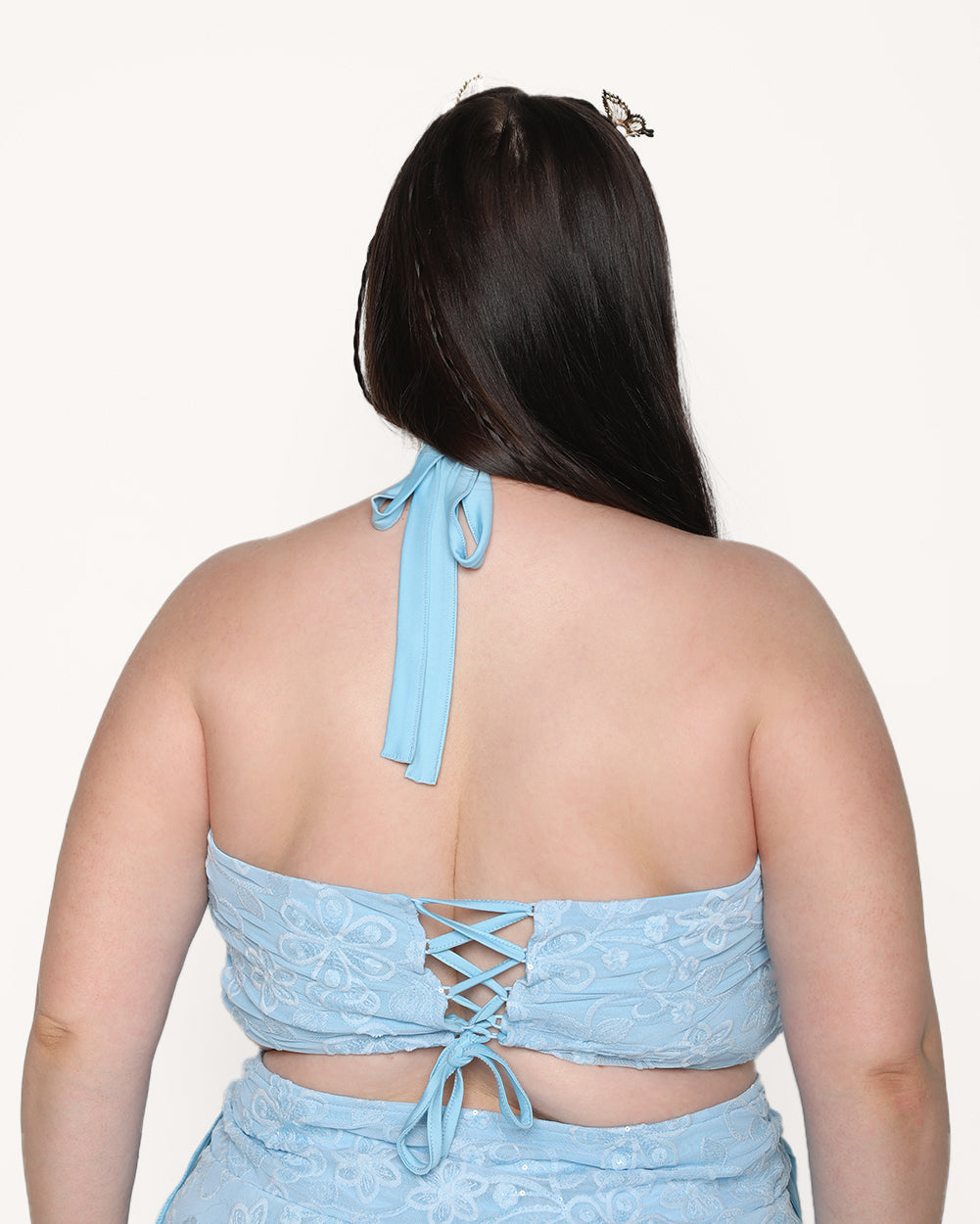 The Faerie Firelight Floral Sparkle Top is every rave girl's dream come true! In a soft periwinkle hue. this enchanting piece features a delicate floral print and a halter loop neckline that leaves a trail of magic in your wake.