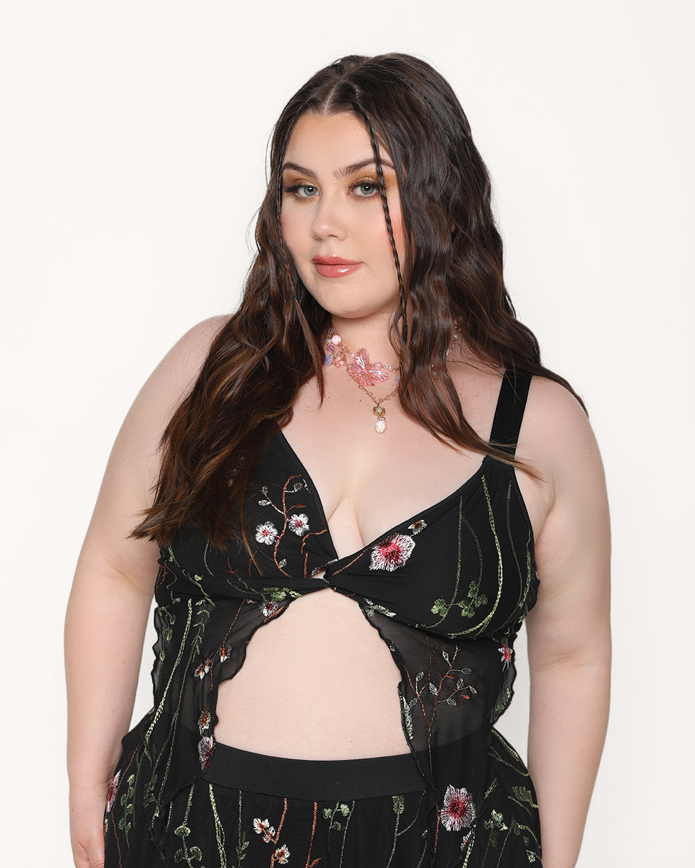 Bloom like a midnight garden with the Lace Flowerfields Stretch Pixie Hem Top! Featuring an asymmetric cut that drapes down the center. creating a flowy and whimsical effect. and charming embroidered wildflowers scattered throughout. reminiscent of enchanting petals that have fallen on the forest floor.