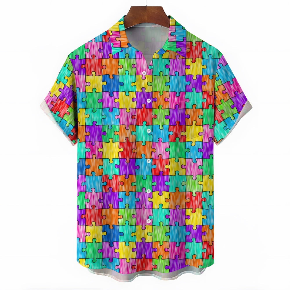 Men's Colorful Puzzle Print Casual Short Sleeve Shirt 2412006001