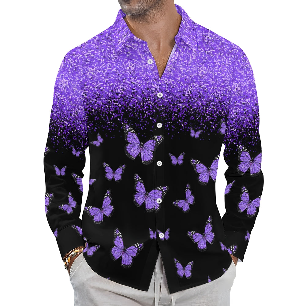 Men's Purple Glitter Butterfly Printed Long Sleeve Shirt 2412005344