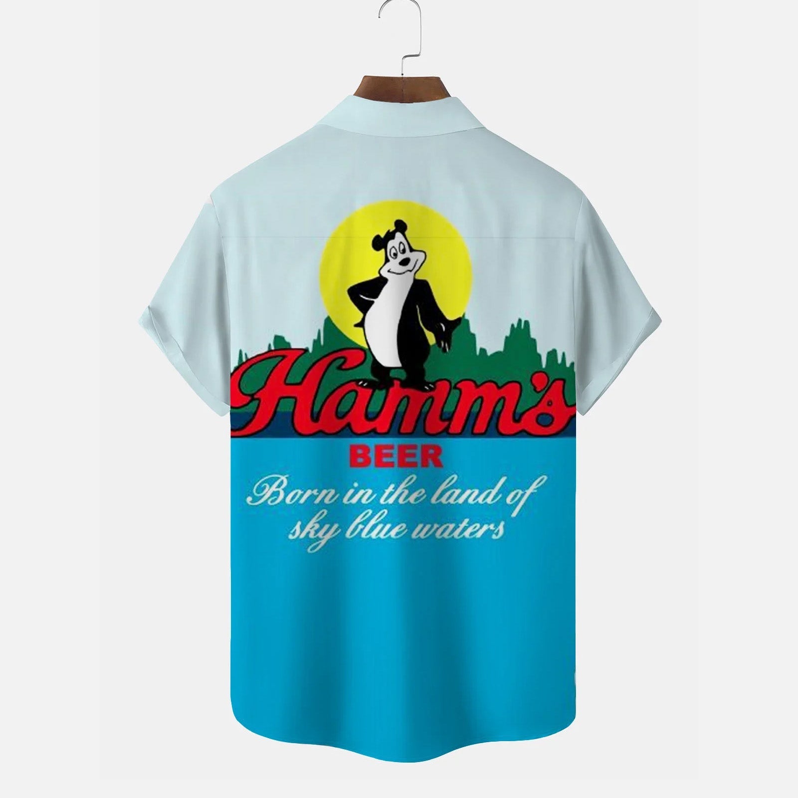 Retro Cartoon Funny Beer Print Men's Button Pocket Short Sleeve Shirt