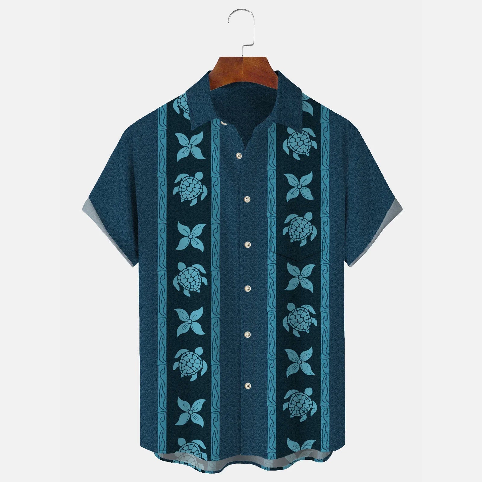 Retro Sea Turtles Floral Bowling Print Textured Men's Button Pocket Shirt